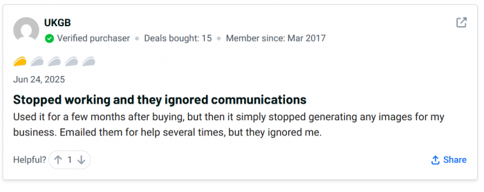 ● Verified buyers report periods where the platform was barely usable—generation errors, extreme slowness, and no clear communication.