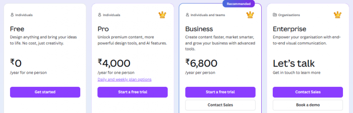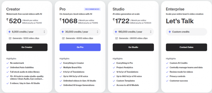 Starting price: Canva offers a generous free plan with essential video tools, while Canva Pro sits at a mid-tier subscription point with brand kits, premium templates, and collaboration features unlocked.