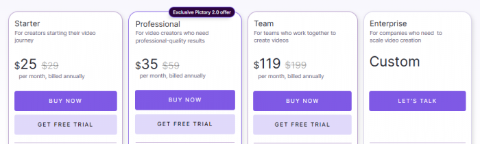 Starting price: Pictory typically offers entry-level plans in a competitive monthly range with limits on video length and number of projects per month, scaling up for agencies and heavy users.