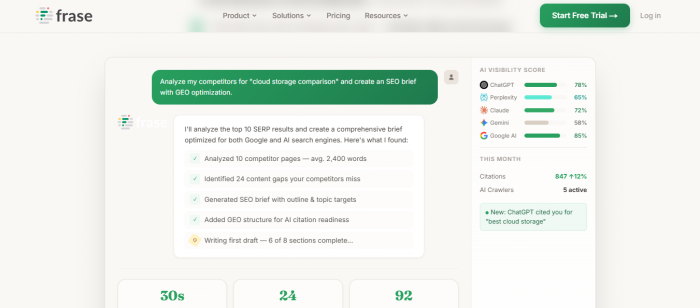That makes it a strong option for SEO teams and publishers who need to build content at scale. Its GEO article approach is especially useful in 2026, when visibility in AI search tools matters almost as much as traditional Google rankings.