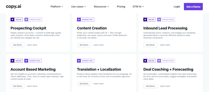 | Copy.ai | Sales and marketing automation | $29/month | GTM workflows and AI agents |