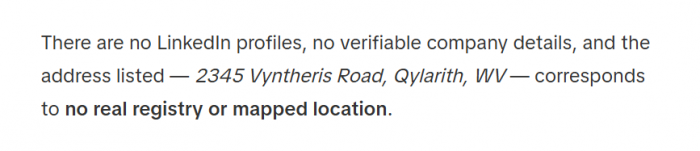 ● The postal‑style address associated with the project (for example, “2345 Vyntheris Road, Qylarith, WV 13829”) struggles to match verifiable real‑world locations.