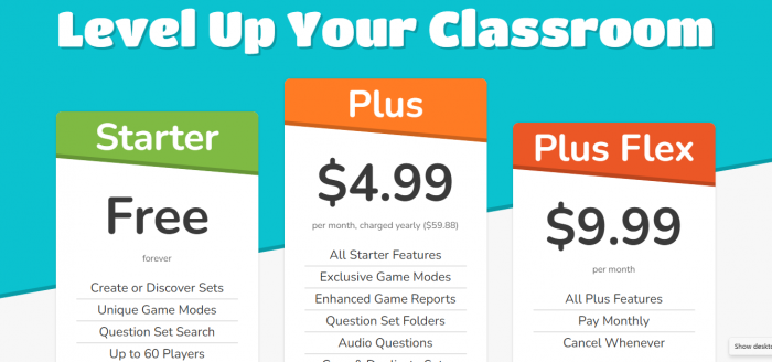 Blooket runs on a freemium model. There’s a solid free tier and optional upgrades for heavier users and bigger classes.
