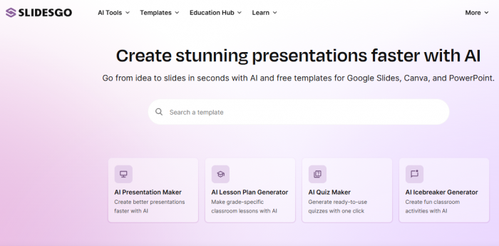 Slidesgo includes AI tools aimed at teachers, such as lesson planners and quiz generators. These are widely used in schools, but again, they function best as drafting aids, not replacements for subject expertise.