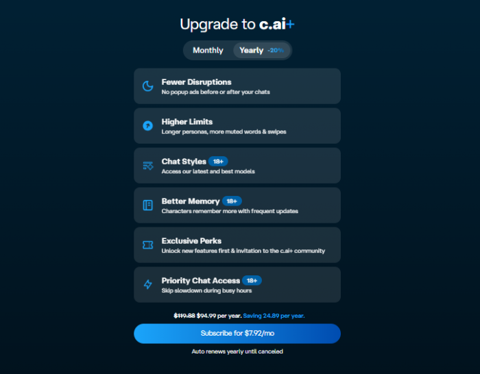 ● Premium tier (often branded as c.ai+ or similar): Faster response times, Priority access during peak load, Larger context windows or better memory behavior and Early access to certain features (e.g., more advanced Scenes or media features, depending on the current roadmap).