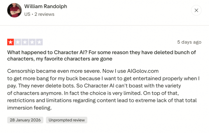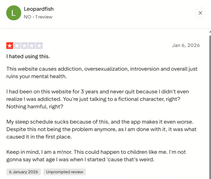 ● Addictive but emotionally risky: The Trustpilot AI summary itself notes worries about the app’s addictive nature and potential unsafety for younger users, especially when users form strong emotional bonds with bots.