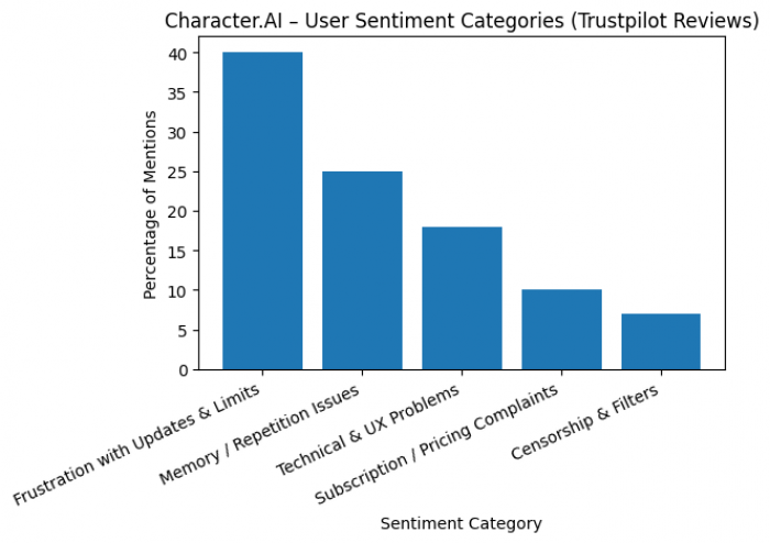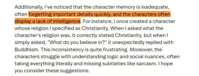 ● Poor memory and off‑character behavior: Many reviewers complain that bots forget recent messages, lose their own lore, or suddenly turn into a generic assistant instead of staying in character, making long‑term roleplays “impossible.”