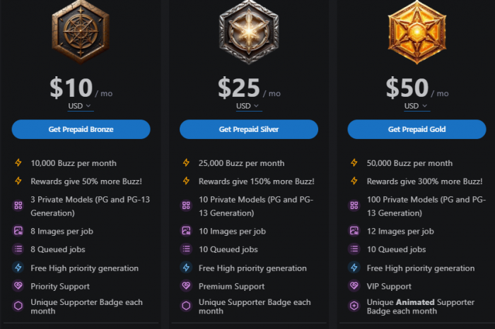 Publicly listed tiers include monthly plans ranging from $10 to $50, each increasing Buzz allocation and private model capacity. The availability of free access explains why Reddit discussions frequently characterize the platform as “free unless you rely on hosted GPUs.”