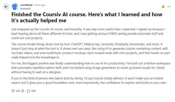 Reddit and YouTube reviewers often land on a nuanced verdict: good structure, solid for beginners, but marketing can lean more toward “AI will change your income forever” than “AI will make your work 30–50% more efficient if you actually apply it.” reddit