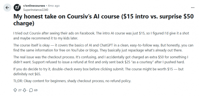 A noticeable chunk of negative reviews exist because people didn’t realise the “trial‑ish” first payment was not a one‑off. That’s not unique to Coursiv, but it’s a pattern you should be conscious of.