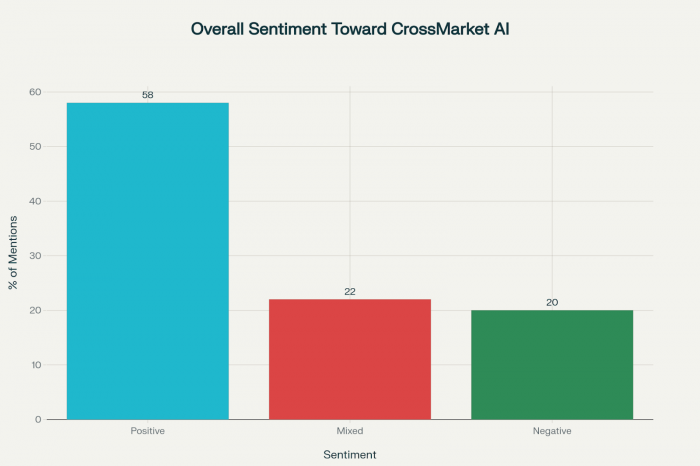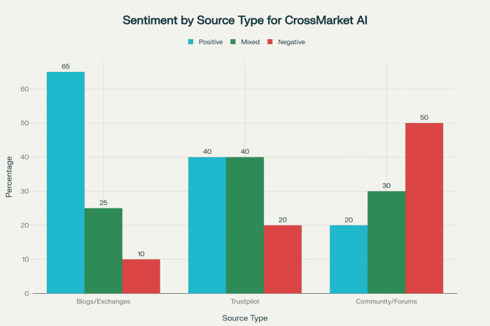 CrossMarket AI is an analytics and trading signal tool that claims to use AI for cross-asset insights across crypto, forex, and indices. However, behind the branding, its credibility, transparency, and real-world impact are highly questionable. Across sources in 2025, only about 58% of opinions are positive, with 22% mixed and 20% negative—a much weaker reputation than its established competitors.