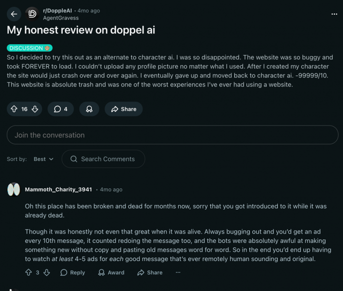 As the platform grew, many users reported that AI responses became shorter, repetitive, or prone to copying user input verbatim. Reddit threads frequently describe periods where Dopple felt “dead” or “broken,” followed by partial fixes and regressions.