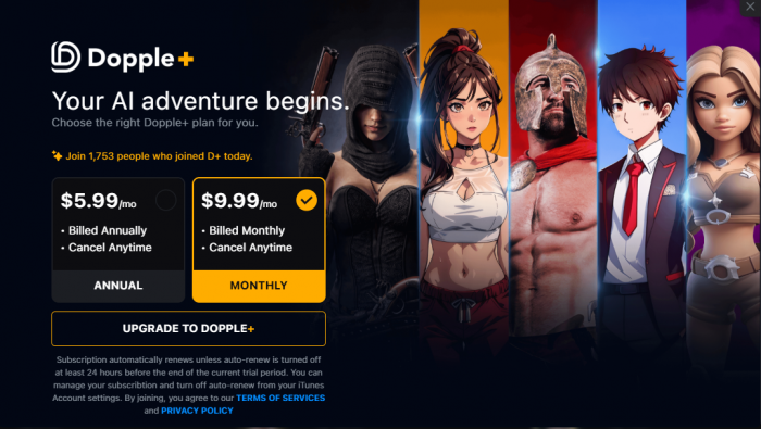 The Dopple+ subscription costs around $9.99 per month, with discounts for annual billing. Premium features include an ad-free experience, enhanced visuals, exclusive Dopples, NSFW access, and early feature releases.