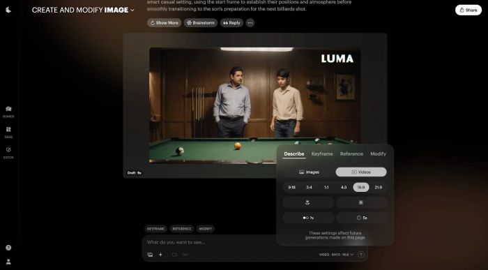 Dream Machine handles text‑to‑video, supports keyframe‑style guidance between start and end images, and offers toggles between draft and higher‑quality modes. The default aesthetic leans toward glossy, ad‑style visuals that instantly look like spec spots or music video fragments.