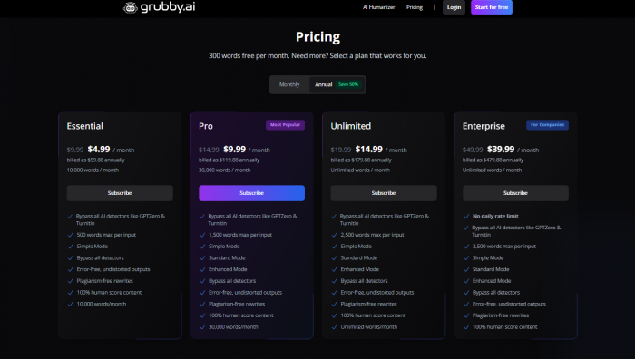 The free and low‑tier plans let you see how the engine behaves, but the thing Grubby promotes hardest detector‑specific humanization at scale only really exists on the mid/high tiers. That makes it more of a specialist tool for people who already know they need that, not a casual student toy.