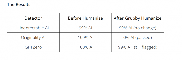 ● On smaller detectors (ZeroGPT, Writer’s detector, etc.), Grubby sometimes does well, sometimes not—another sign that its patterns work better against some detection models than others.
