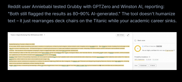 ● Multiple Reddit users who tested Grubby against GPTZero, Winston AI, and other detectors reported that scores barely moved—80–90% AI before and after leading them to say it “doesn’t humanize text, it just rearranges deck chairs on the Titanic.”