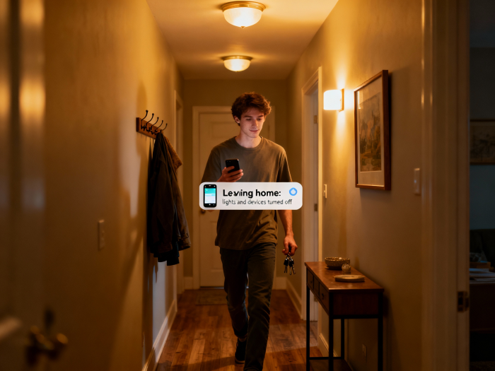 When your phone leaves home Wi‑Fi, a “leaving home” routine turns off lights and devices.