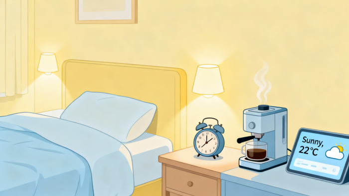 One alarm that also turns on soft lights, starts coffee on a smart plug, and reads weather + first meeting.