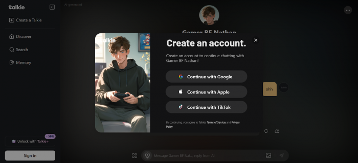 The very first thing Talkie AI does is not let you chat freely. It gives you a “taste.” You get about 3 to 4 messages before it politely stops you and says, in its own way, “Alright, now log in if you want more.” It is a classic teaser strategy, and it works.