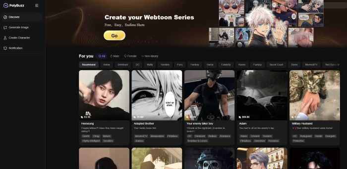 The first layer is the character ecosystem. Polybuzz provides a very large catalog of AI personas, most of them inspired by anime, VTuber culture, gaming, and fiction. Discovery is structured like a social feed: