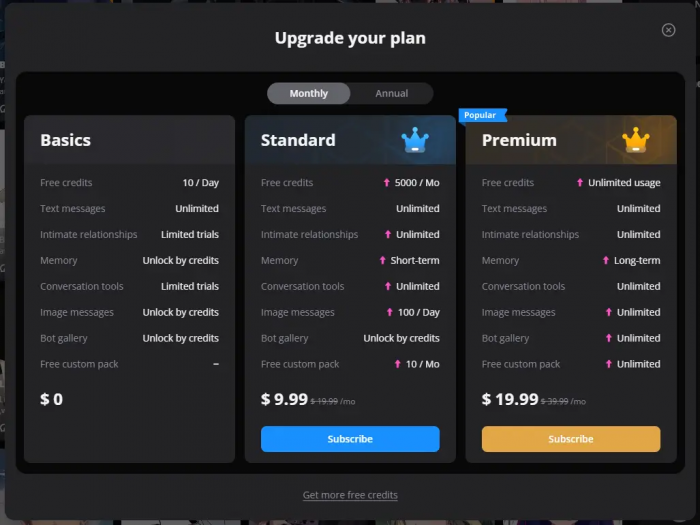 ● Free: 0 USD/month; roughly 10–50 text credits per day, about 3 image messages/day, ads shown, NSFW mostly locked.