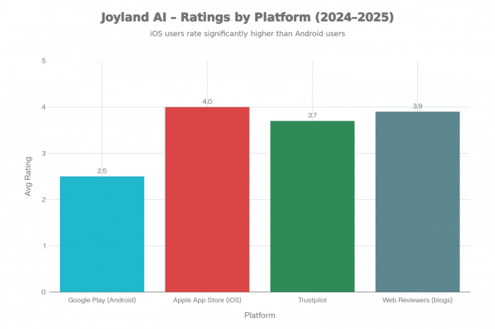 Here is a bar graph visualizing Joyland AI’s average rating by platform (0–5 scale), based on the synthesized review data.