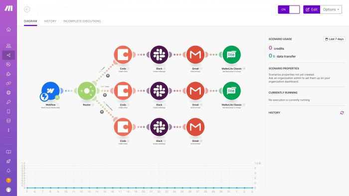 Make handles that complexity natively inside a single scenario. Its Router module splits a workflow into separate branches based on conditions. Its Iterator processes each item in an array individually. Its Aggregator merges multiple bundles back into one. Error handling is built into the canvas itself, with dedicated fallback paths rather than just email notifications. A lead enrichment workflow requiring scoring, conditional routing to different team members, and CRM logging is clean and readable in Make. In Zapier, the same workflow typically requires several separate Zaps and careful sequencing.