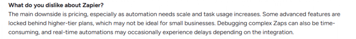 The most repeated complaint about Zapier in 2026 is the pricing wall. Teams that start on lower tiers and scale their automation volume quickly discover that the monthly bill climbs faster than expected, particularly with multi-step Zaps where every action counts as a separate task. Several Reddit users describe reaching $249 per month on Zapier before migrating to Make and immediately reducing costs by 60 to 80 percent for equivalent workflow volume.