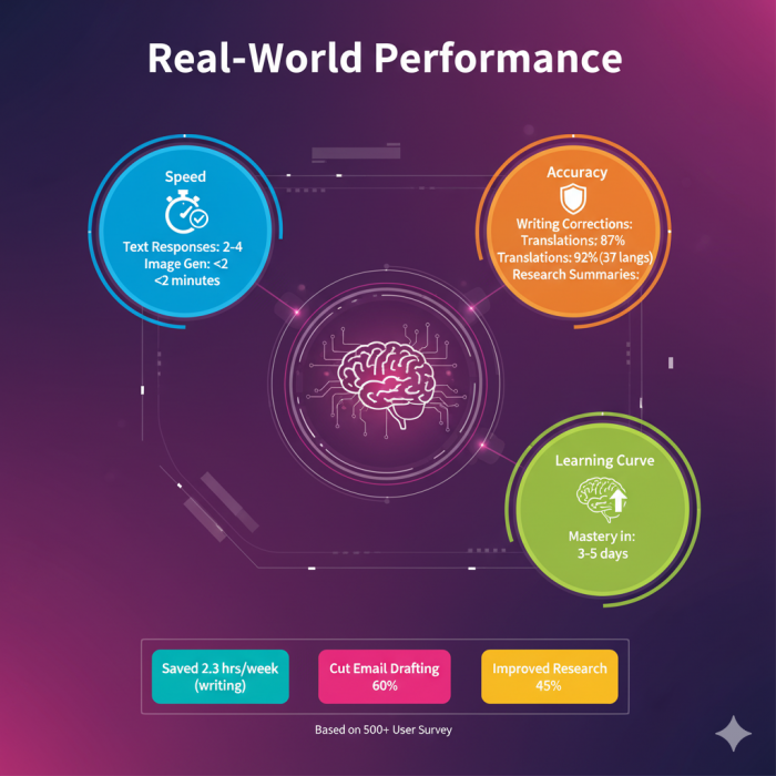 ✅Accuracy: Writing corrections (87%), translations (92% across 37 languages), research summaries (83%).