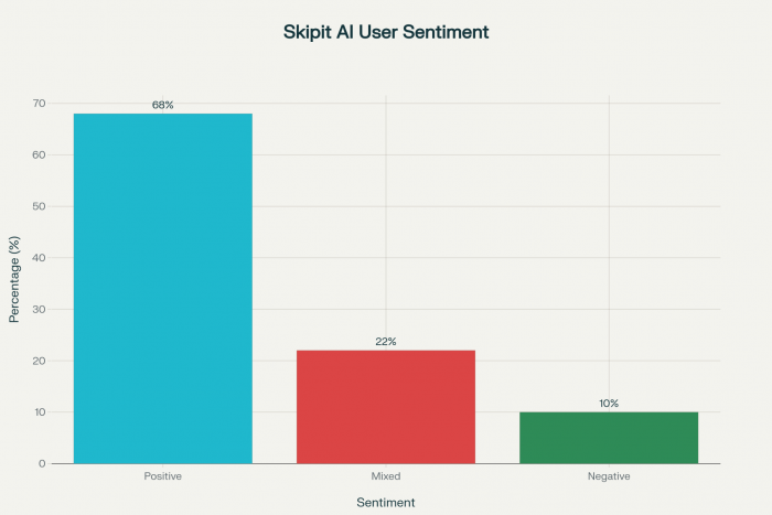 User sentiment shows 68% positive, 22% mixed, and 10% negative feedback. Overall, users are largely satisfied with what Skipit AI offers, and the image clearly reflects that as 68% of the reviews are positive.