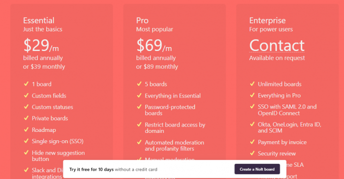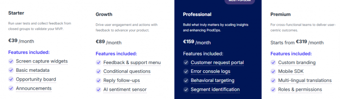 Pricing: Free plan for up to 20 feedback items; paid plans $45.58–$372.72/month