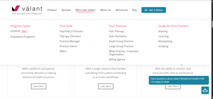 | Group practice scaling beyond 10 clinicians | Valant.io | Multi-location, RCM dashboards, IOP/PHP capability |