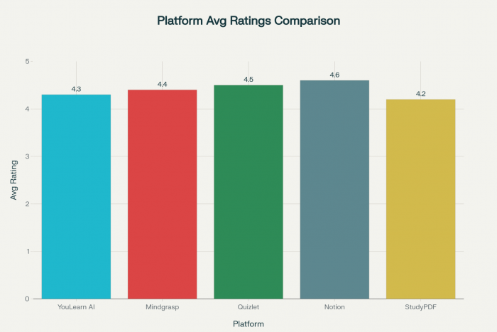 Compared to competitors like Mindgrasp, Quizlet, Notion AI, and StudyPDF, YouLearn AI scores respectably in user ratings—though not at the very top.