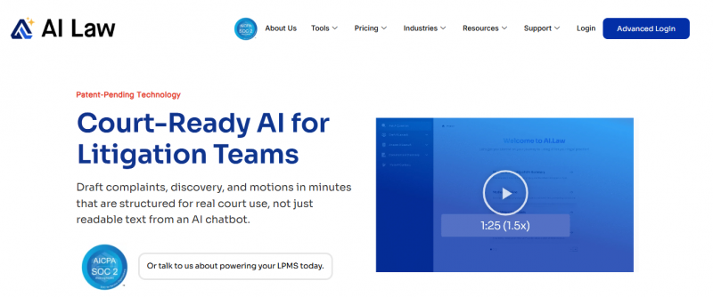 AI.Law focuses on generating court-ready documents from simple case facts. It addresses the time-consuming nature of legal drafting by automating pleadings, discovery, and analysis workflows. At its core, the platform translates unstructured inputs into fully structured legal documents aligned with jurisdictional requirements. It is used by law firms, in-house legal teams, and insurers.