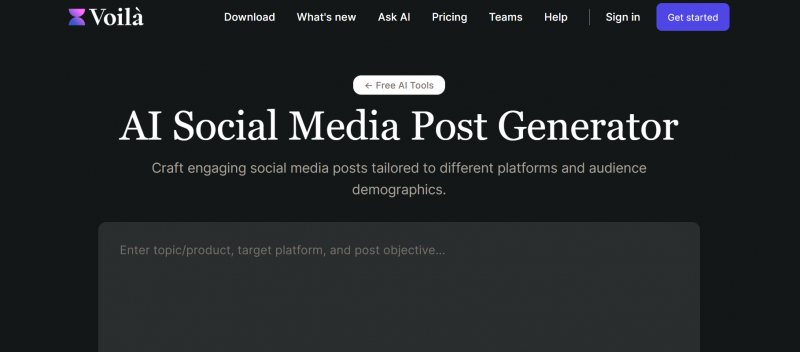 The AI Social Media Post Generator from Voilà (by GetVoila.ai) is an online tool that helps creators, marketers, and business owners generate social media content quickly. It uses AI to produce optimized posts for different platforms, considering audience tone and engagement best practices. With this tool, users can input brief prompts and get content ideas tailored for specific goals like brand awareness, traffic, or conversions. The generator is part of Voilà’s broader suite of AI tools accessible from the web interface and works across browsers, documents, and other text environments. It supports multiple languages and tone options, making it useful for varied content strategies. The core aim is to streamline the content creation process, reduce time spent drafting posts, and help maintain a consistent posting schedule without switching between separate tools.