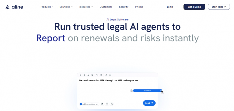 Aline centralizes contract lifecycle activities using structured AI workflows. The platform combines drafting, redlining, approvals, analytics, and electronic signatures into one system, reducing reliance on scattered tools. Aline’s AI copilot accelerates contract review and reporting, while integrations with cloud storage and CRM systems support cross‑department workflows.