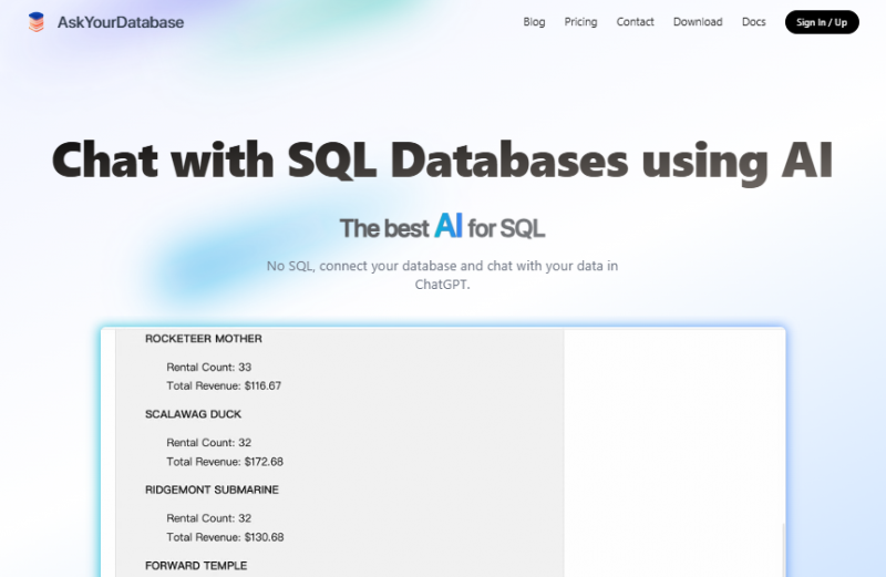AskYourDatabase connects to SQL databases through a desktop application. Users ask the AI chatbot to find data instead of running queries. It operates as an interactive system that maintains conversation context for follow-up questions. The tool reads database schemas automatically and supports one-click visualizations and dashboard creation. Available as a desktop app for internal use with local data storage, it also provides an embeddable chatbot for websites. On-premise deployment handles security needs. It works with databases like MySQL, PostgreSQL, SQL Server, Snowflake, and Google BigQuery.