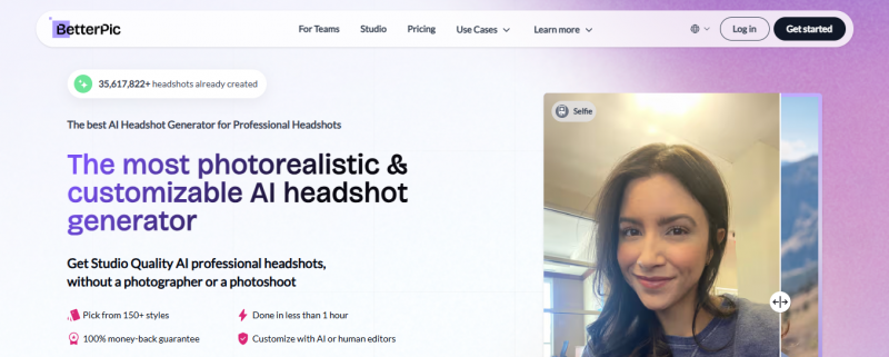 BetterPic generates 4K AI headshots from user-uploaded photos. Users upload selfies, select from 150+ styles, and receive professional portraits in under an hour via email. The platform emphasizes portraits, privacy, and realism compared to general AI generators. Photos remain private, deleted after 30 days, and come with full commercial license. An AI analysis ensures perfect results from uploads, with options for redos, manual edits at $8 each, or AI Studio tweaks using credits. Supported formats include JPEG, PNG, and WebP.