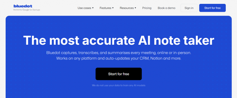 Bluedot records conversations on Google Meet, Zoom, Teams, Webex, and in-person without bots. It transcribes meetings, generates AI notes, action items, and highlights. Users capture video, audio, or transcription only, with notes syncing to CRM and Slack. The tool handles technical terms, to-dos, abbreviations, and speaker identification accurately across browser, desktop, or mobile.