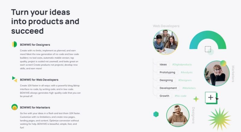 BOWWE is a browser-based builder that combines no-code drag-and-drop editing with optional low-code and full-code capabilities. I can start from a blank canvas or use one of 500+ fully customizable templates, then refine my project with 570+ widgets and pre-made sections that automatically adapt to my branding and layout.