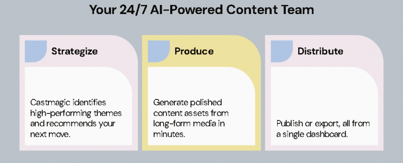 Castmagic is a content repurposing platform designed to transform audio and video recordings into written assets. It converts recordings into transcripts and then produces summaries, highlights, quotes, and ready-to-use content formats. The platform is commonly used for podcasts, interviews, meetings, and long-form discussions, helping teams reduce manual effort involved in post-production writing. Castmagic focuses on accelerating content workflows by turning recorded conversations into reusable written material.