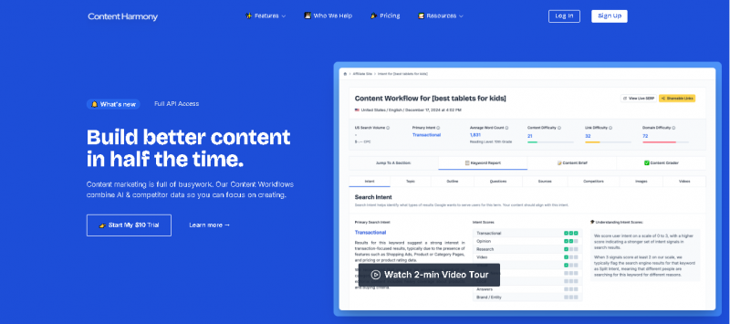 Content Harmony begins by analyzing search engine results for a target topic or keyword. It evaluates competitor pages to identify common themes, subtopics, and terms. Based on this analysis, the platform generates content briefs that outline recommended headings, keywords, questions to answer, and optimization targets. Teams can track content progress, score drafts against recommendations, and refine content before publication.