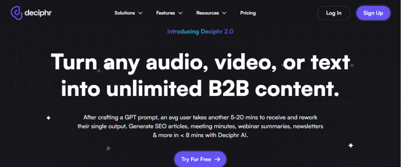 Deciphr AI processes media files to generate transcripts, summaries, show notes, articles, quotes, chapters, white papers, FAQs, newsletters, landing pages, and captions. It handles uploads or URLs to produce these outputs in minutes from one file. The tool offers an AI Assistant that responds to chat requests for editing content style, tone, and format.