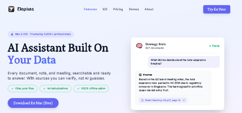 Elephas AI is an AI-powered knowledge assistant designed for professionals who work with large volumes of information. It allows users to import, organize, and query their own content across documents, notes, and media to uncover insights quickly. The tool also delivers writing support, intelligent summarization, and contextual assistance directly within the native environment on Mac and iOS, aiming to reduce the effort of information retrieval and content creation for knowledge workers.