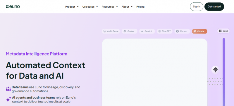 Euno transforms metadata into an automated context layer for data teams and AI agents. It stitches together lineage, code, utilization patterns, ownership, and semantics to enable governance automations without requiring manual upkeep or rigid top-down processes. The platform surfaces trusted, certified data assets to AI agents in real time, allowing them to deliver reliable, explainable results. Euno integrates with dbt and Looker, providing column-level lineage, semantic search, and rule-based classifications that flag which assets meet organizational standards.