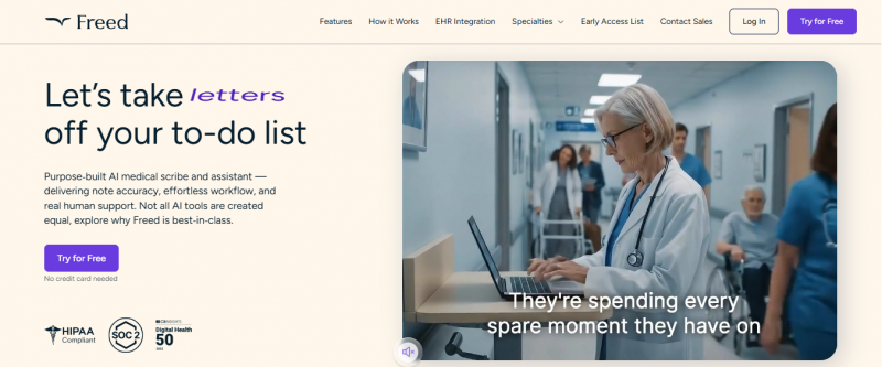 Freed provides an AI medical scribe that transcribes patient visits and generates notes in clinical format. It captures medical terms and prescriptions accurately while excluding background conversations. Notes organize into EHR-ready structure, including SOAP notes based on guidelines and templates.