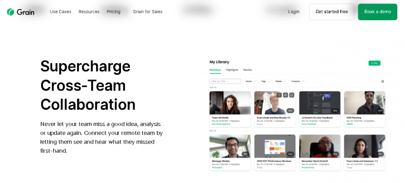 Grain connects with video conferencing platforms such as Zoom, Google Meet, and Microsoft Teams to automatically capture meetings and generate searchable transcripts. AI is used to tailor summaries and produce follow-ups or action items, while users can create highlights, playlists, or reports from recorded content. The platform also supports custom note templates and integrates with productivity and CRM systems to automate workflow steps.