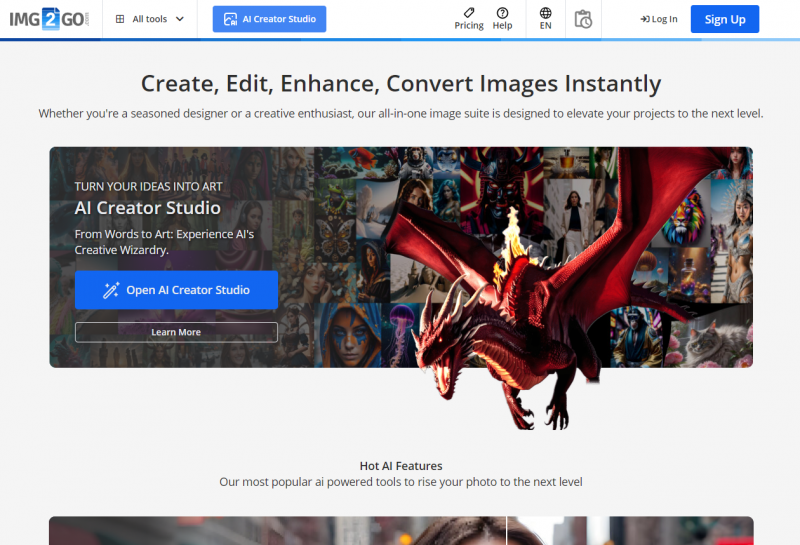 Img2Go provides powerful AI image editing tools. Each tool simplifies editing and enhances images.