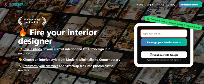 InteriorAI enables uploading a photo of an interior, exterior, or garden space to generate redesigned versions in selected styles. It transforms spaces into photorealistic renders using modes like Virtual Staging AI for furnishing empty rooms, Freestyle for generating designs from scratch, Sketch2Image for converting sketches to renders, and SketchUp for enhancing screenshots into high-resolution images. Users access 30+ room types and 50+ styles in a studio after signup. The tool creates immersive 3D environments for walkthroughs and handles outdoor designs with plants and trees. Generation takes about 25 seconds per design, with up to 16 renders simultaneously. Photos remain private and are not used for training.
